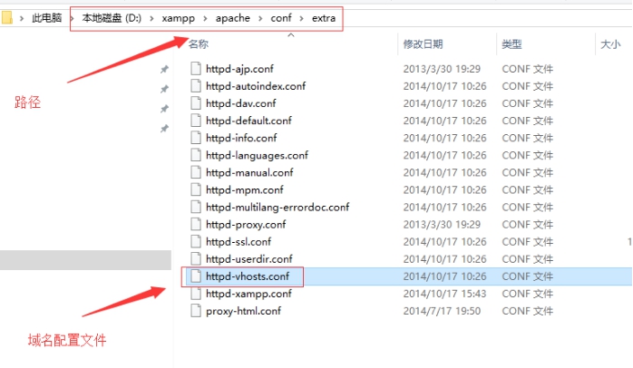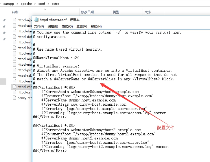 我们需要将访问的域名绑定到网站上,需要设置这个文件:httpd-vhosts.conf