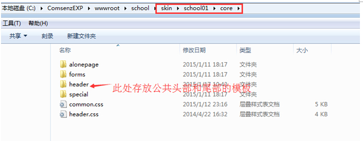 头部和尾部的样式存放在skin—school01---core--header里面;实际上,你可以将样式放在school01一个文件夹里面,只要模板能被调用到即可。