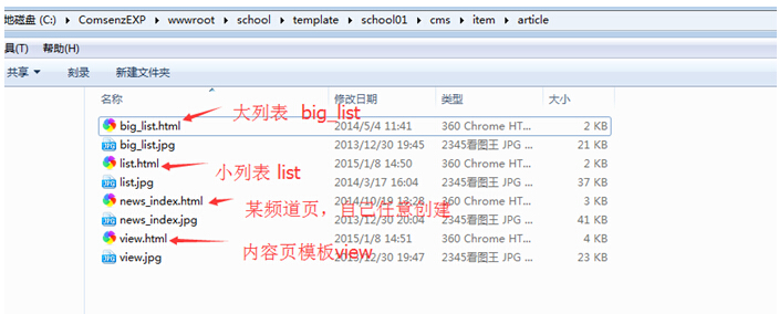 以最通用的文章模型(article)为列;一般有这样几个基础模板,这些模板都可以在创建和编辑栏目的时候选择;当然我们可以新增很多各种不同栏目模板,供更多选择。