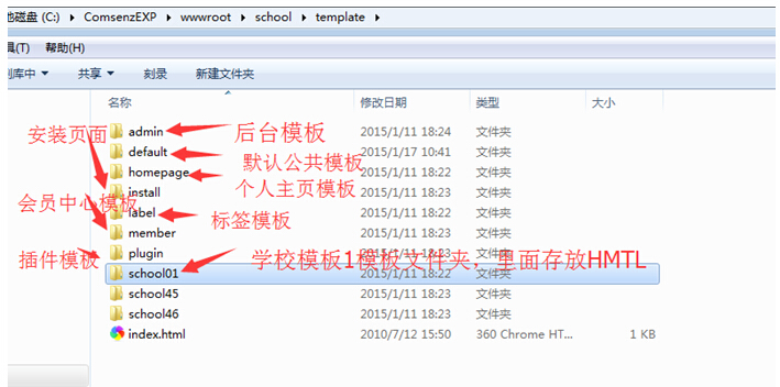打开school目录---可以看到skin和template文件夹;所有模板均只与这两个模板文件夹有关,他的变动不影响程序的运行,只会影响模板样式。