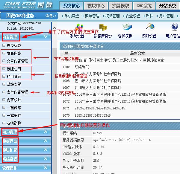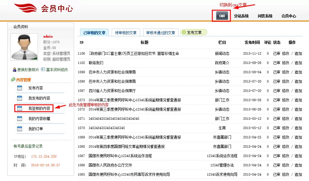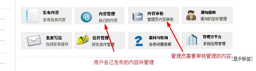 内容管理:左边的内容管理,是普通用户使用;管理自己发布过的内容。