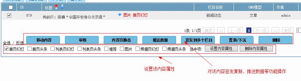上面的菜单可以切换,一般切换到cms(文章系统),下面也跟着变化;下面部分左边是对应按钮。