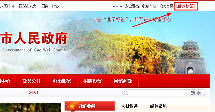 管理员登陆后,可以看到显示标签按钮,直接点击,整个首页就可以进入标签状态,从而可以进行任意编辑修改。