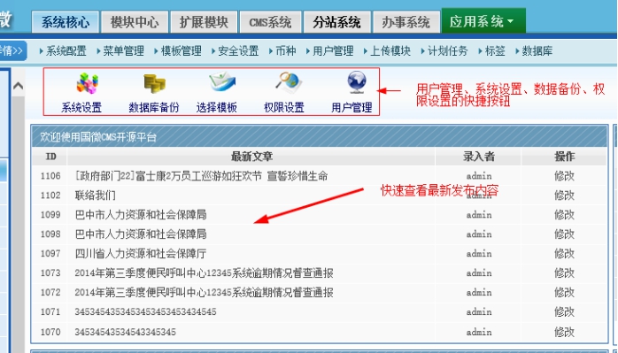 超级管理员可以看到底部的快捷按钮,直接进入所需操作的后台界面;