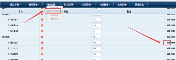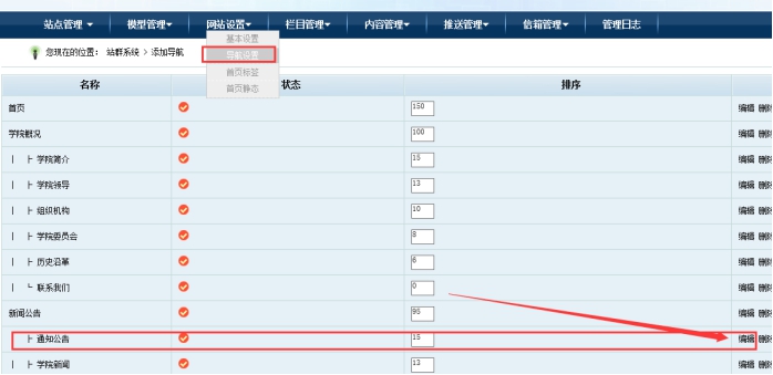 处理方法:分站后台---网站设置---导航设置----点击“通知公告”的编辑按钮
