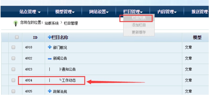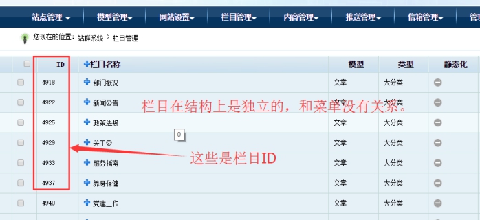栏目:栏目是独立的,和菜单没有关系。左边是栏目的ID号,每个栏目都有一个自己的ID。栏目如下图: