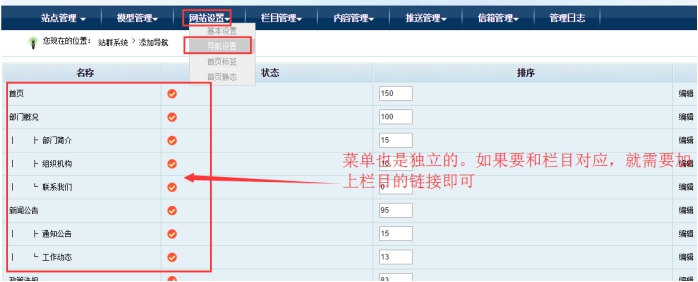 菜单:菜单也是一个独立的东西,他事先本来和栏目没有关系。要产生关系,就需要将菜单上填写栏目链接地址。